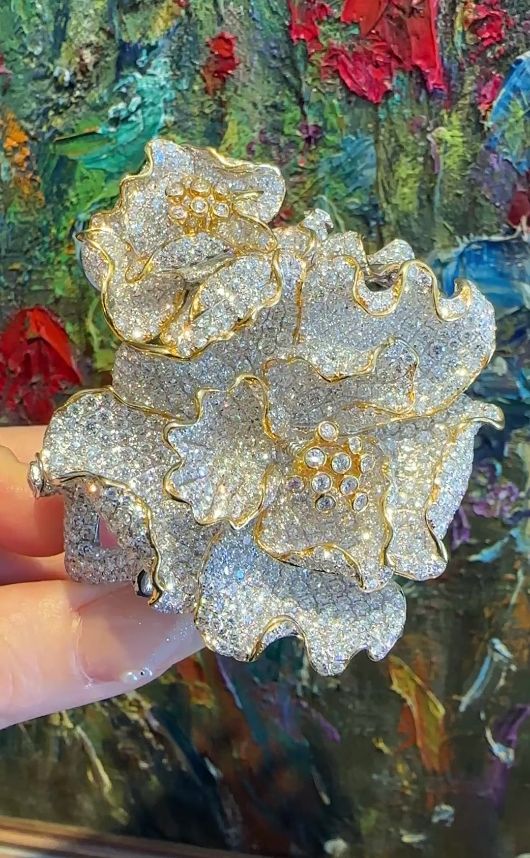 Large 47.80 carats Diamond Flower Bangle Bracelet in 18k White and Yellow Gold