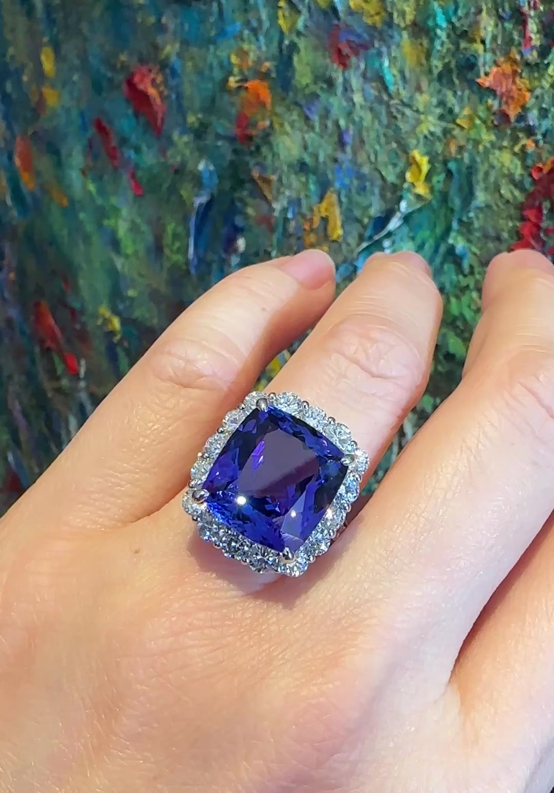 GIA 13.07cts Tanzanite in Diamond Halo Ring in Platinum