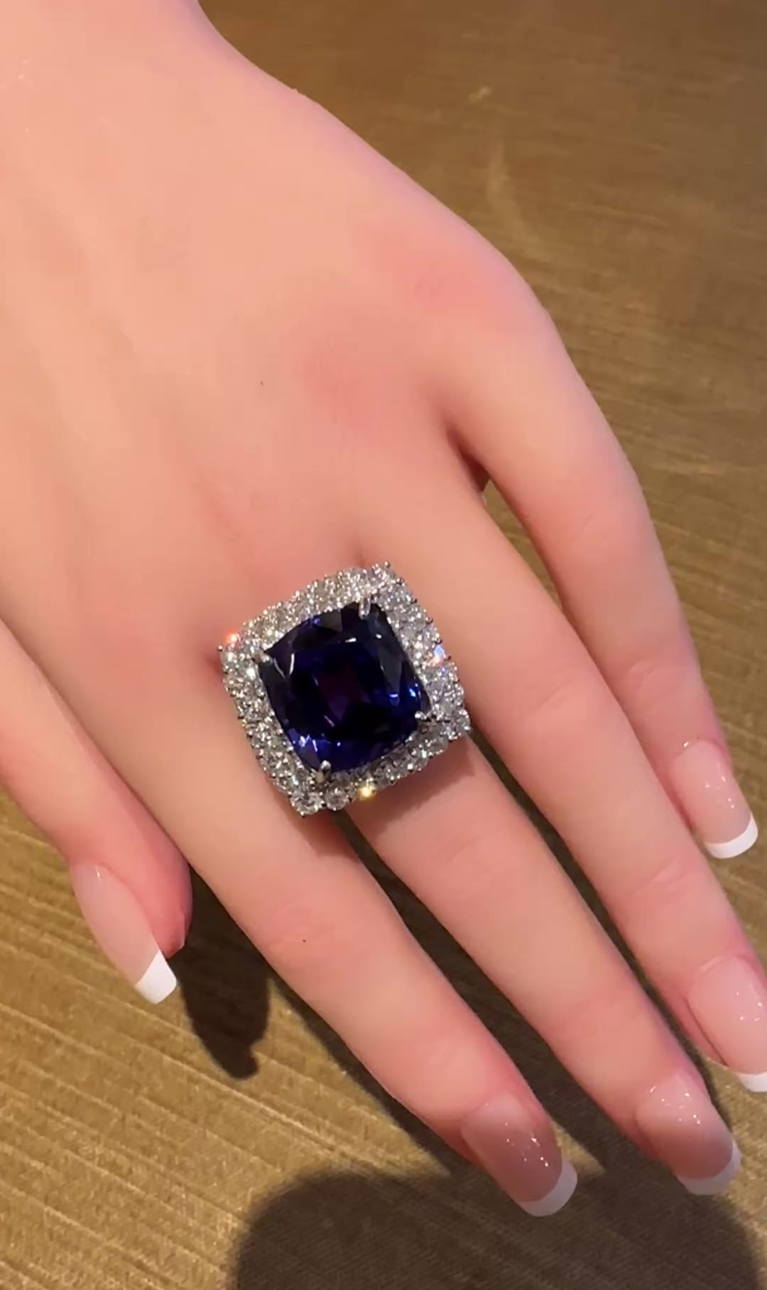 GIA 19.97 carat Cushion Tanzanite Ring with Diamond Halo in Platinum