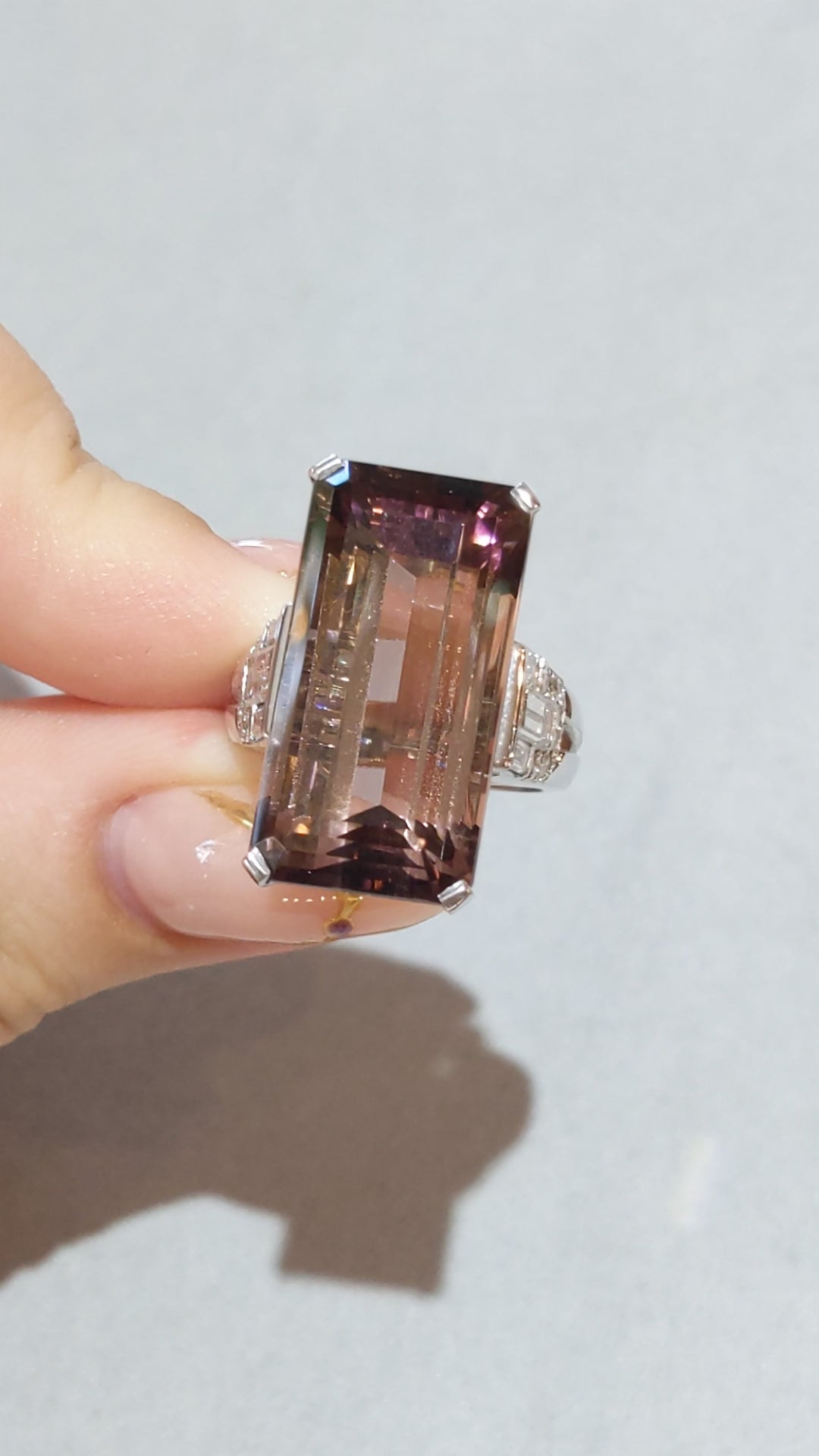 Tourmaline and Diamond Ring features an Elongated Emerald cut Smoky Rose Pink Tourmaline accented by Baguettes and Round Diamonds set in 18k White Gold.