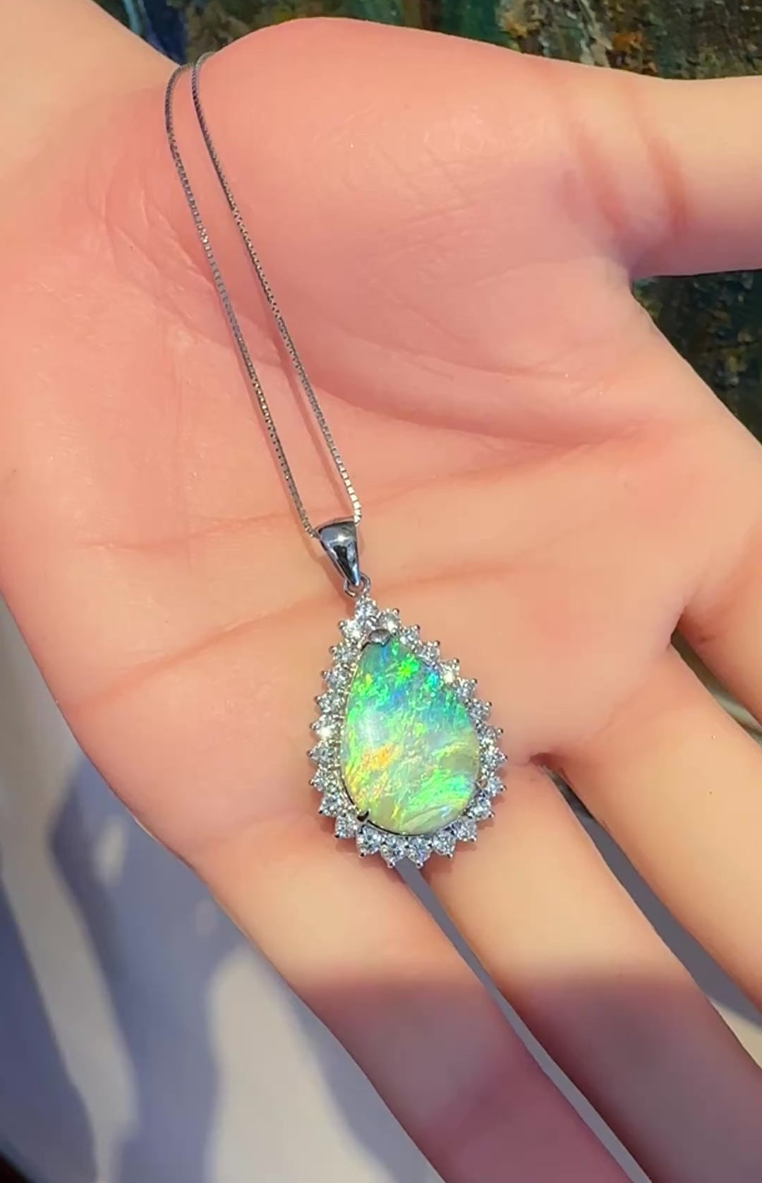 Boulder Opal and Diamond Pendant Necklace features one Pear-shaped Boulder Opal with a mix of light and dark background and play of greens, blues, and oranges surrounded by Round Brilliant Diamonds, all set in Platinum on a Platinum Chain.