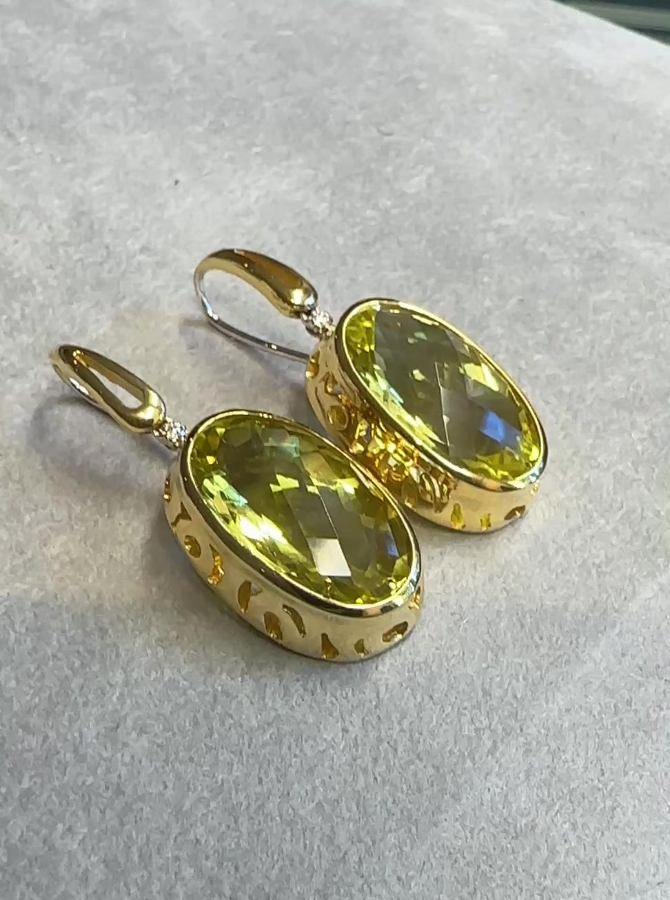 Citrine and Diamond Earrings by Roberto Coin features large Faceted Oval Yellow Citrines in bezel setting with a single Round Diamond atop, all set in 18k Yellow Gold. The earrings are secured by large hook clasps for pierced ears.