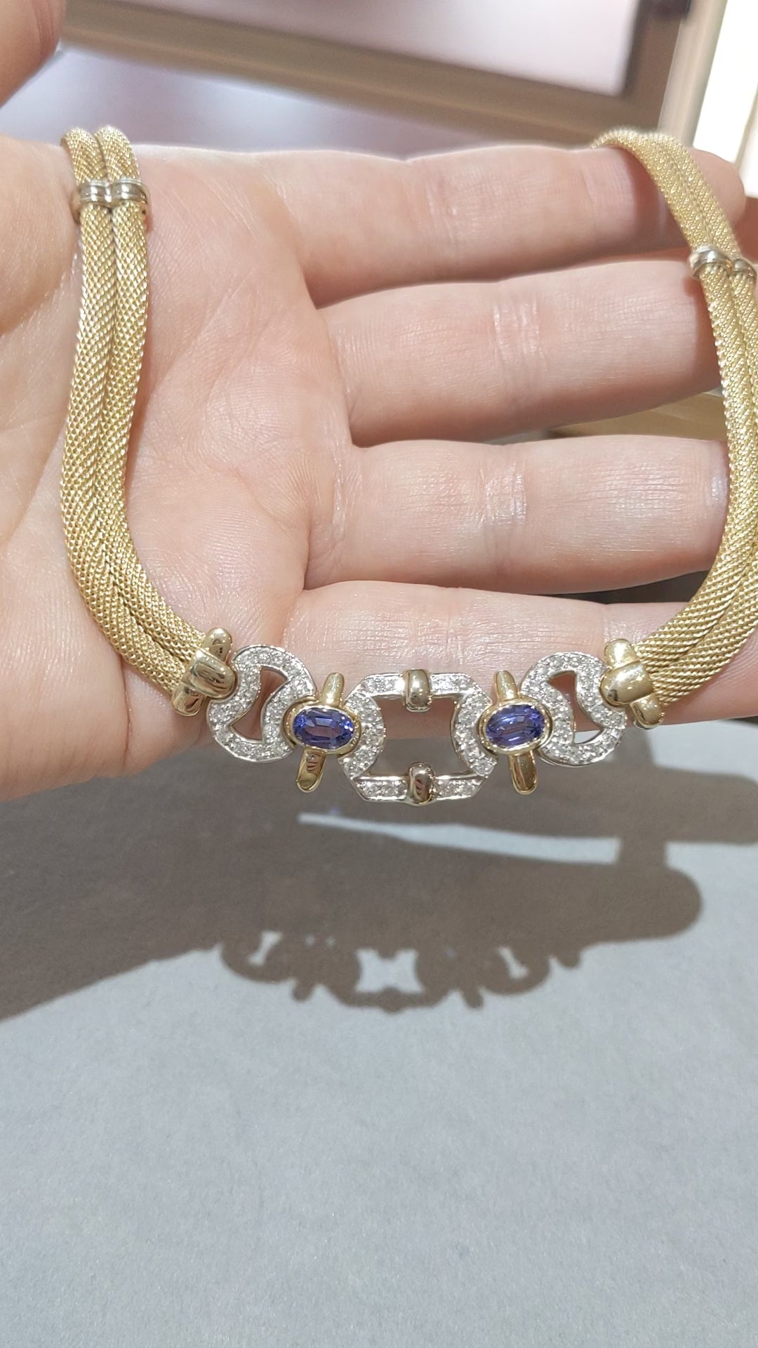 Tanzanite & Diamond Mesh Necklace in 14k Yellow and White Gold Italian