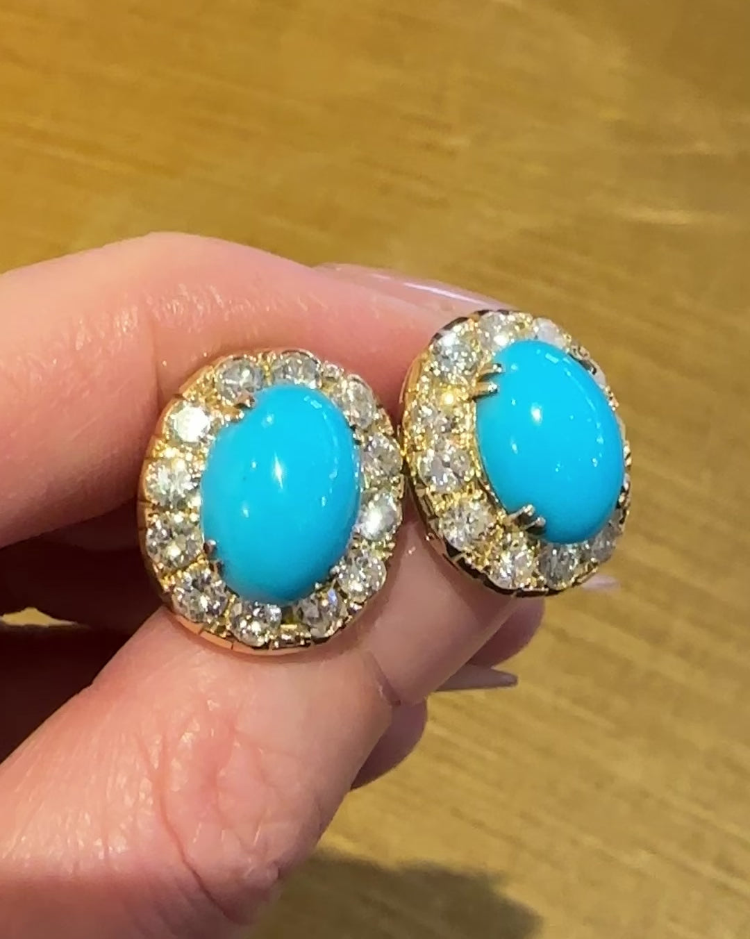 Turquoise and Diamond Halo Button Earrings in 18k Yellow Gold